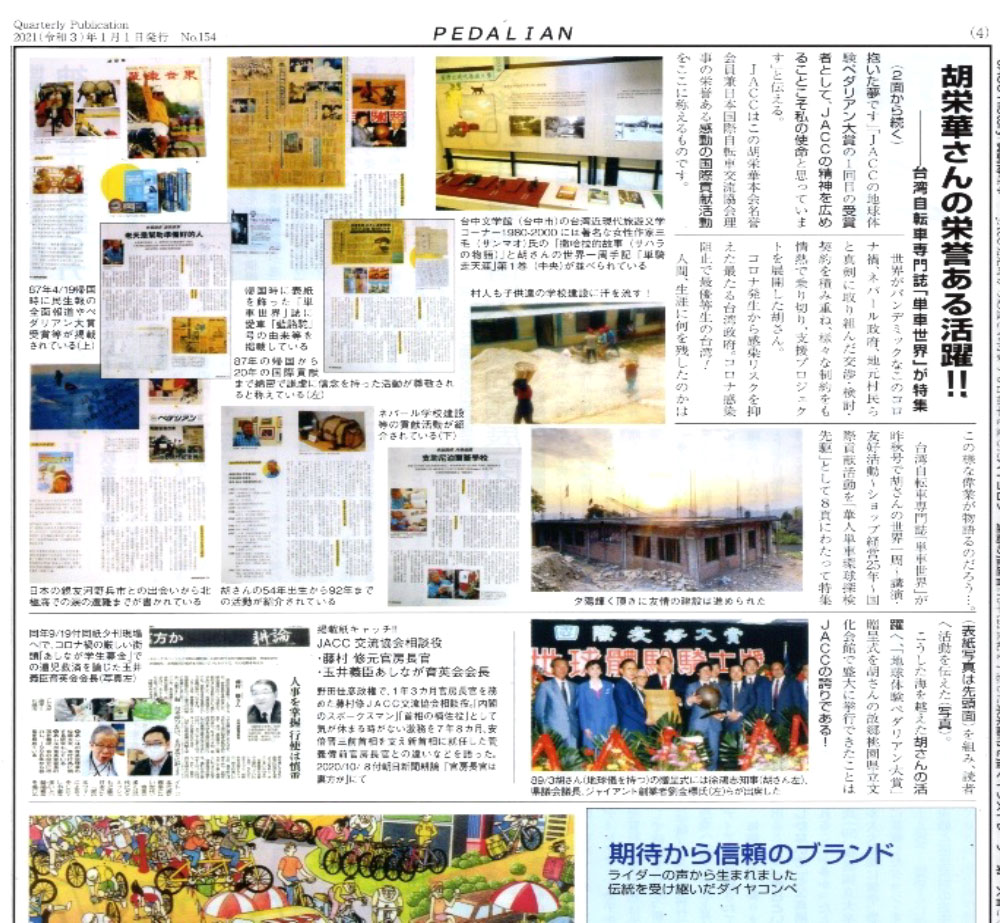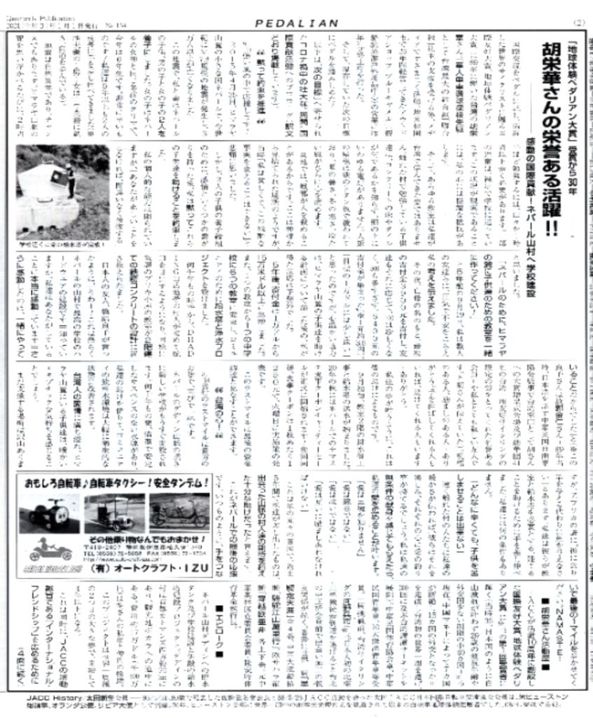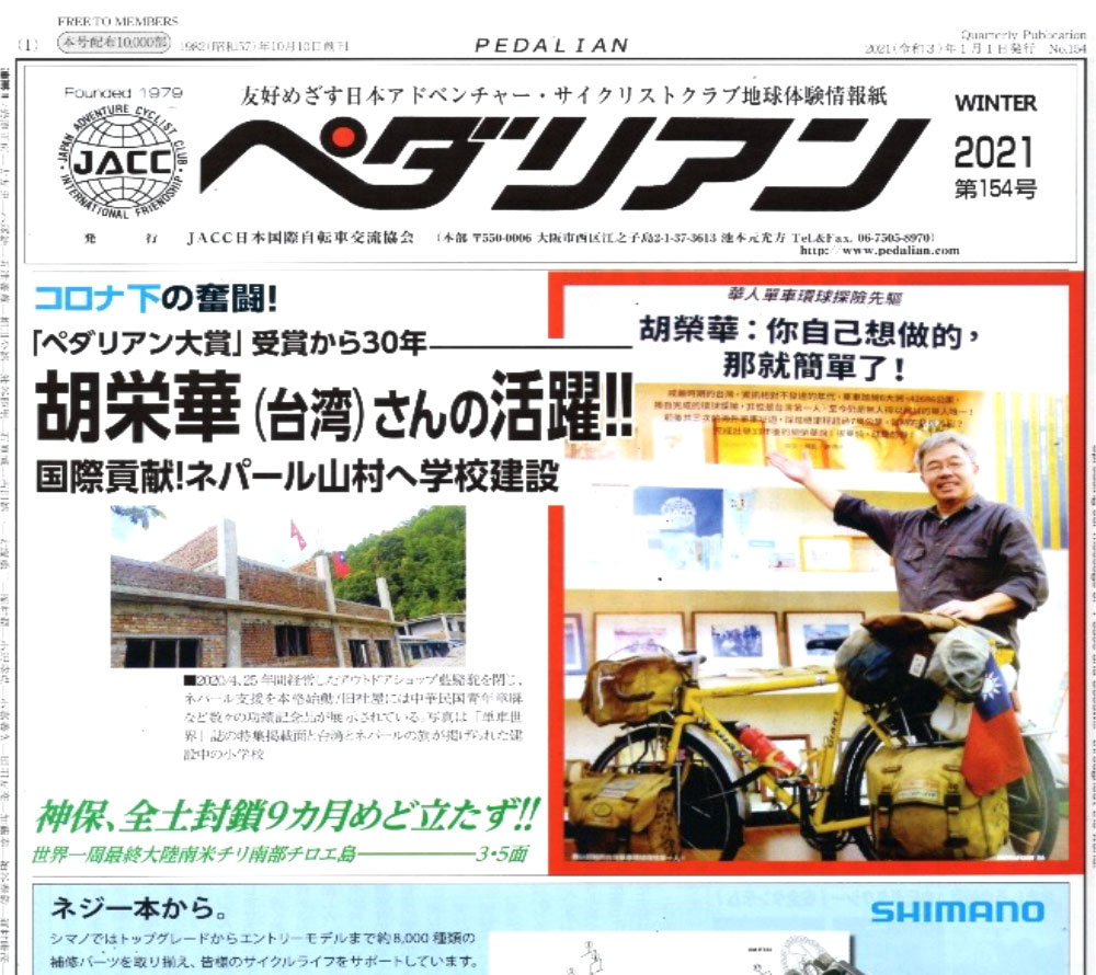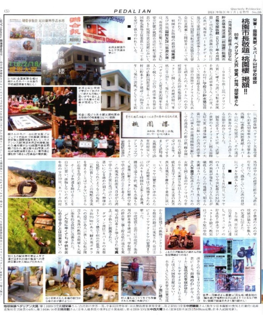 第1回「地球体験ペダリアン大賞」を受賞した台湾の胡 栄華さんのネパール山村に小学校建設、給水塔、水汲み場設置の国際貢献は「ペダリアン」第154号(2021年1月1日発行)、第156号(7月1日発行)特集で紹介してきました。
