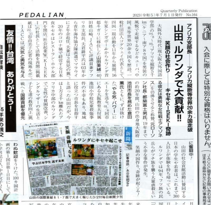 JACC活動紙2023年夏発行ペダリアン第164号で山田の活躍を紹介。自転車冒険軌跡等と23年3月2日付毎日新聞夕刊が1・7面で大きく報じた国際貢献記事を掲載した。