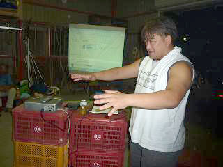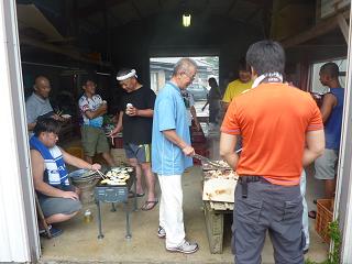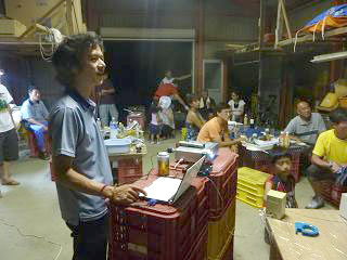 雨を避けるために大きな農業倉庫内で。食事とお酒が体に入ると話しが次第に弾んでくる。初参加の面々もいつのまにかうちとけられました。これから世界に出発を計画中の会員はしっかりと情報をつかんだかな。
