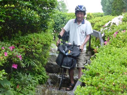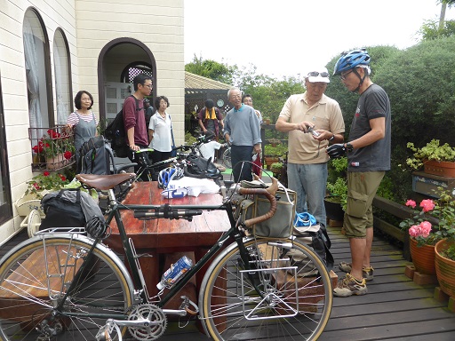 5月31日朝 伊豆高原青い風ユースホステルの中庭にて。天気予報では雨だったのに、晴れ女、晴れ男のおかげで晴天に恵まれました。今年(2月1日~3月8日)東南アジアサイクリングを実施したランドナー車(写真正面)と日名保彦会員(写真右端)