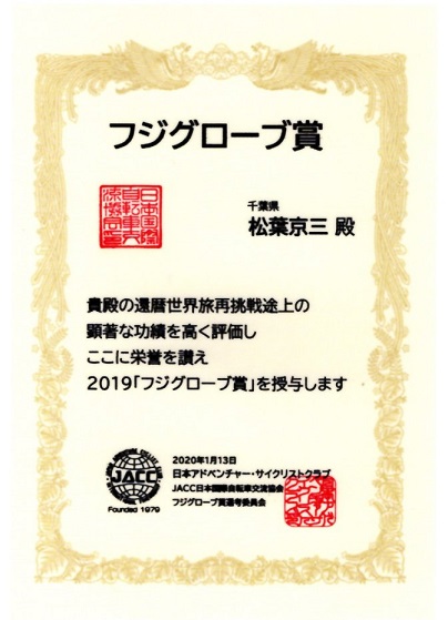 紙面で大活躍! 還暦世界旅再挑戦途上の松葉副代表に第7回2019「フジグローブ賞」!