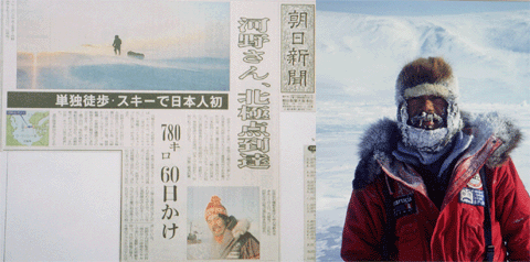 2001年3月26日、河野は支援者のデッカイ夢とロマンをソリに乗せ、元気よく出発。氷原689kmを踏破。陸地ワードハント島へ84km手前の氷上を前進中、5月16日、不運にもプレッシャーリッジという思わぬ火山が爆発するような現象に遭遇。帰らぬ人となった。
