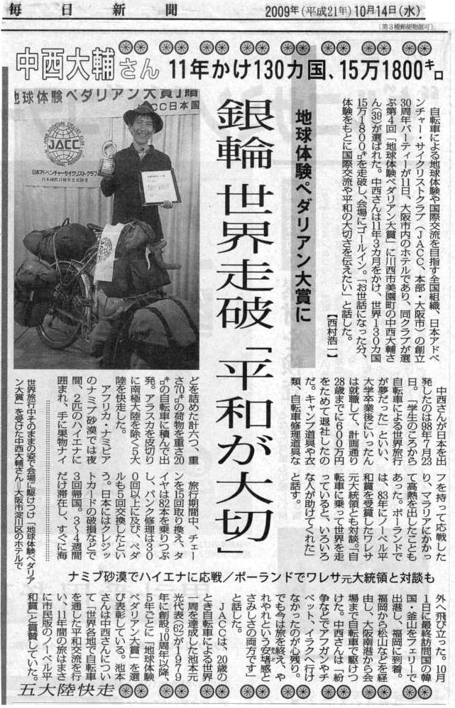JACC日本国際自転車交流協会が発信する「平和と友好の地球体験」を深める銀輪大使として類を見ない活躍を果たした中西大輔さんは、南米ボリビアやペルーなどでは功績が称えられ、名誉市民・名誉州民章を4回受章し、ポーランドのマルボルク市長やチュニジアのサイクリング連合会長からJACCへの友好親書を受け、スペイン、フランス等で講演会を行うなど、その友好平和活動は各地の新聞紙誌が取り上げている。それらの活躍は第4回「地球体験ペダリアン大賞」に相応しい内容で、30周年を迎えたJACCの記念セレモニー(2009年10月11日於ホテルクライトン新大阪)で、藤木高嶺JACC交流協会代表理事より大賞を受けた。