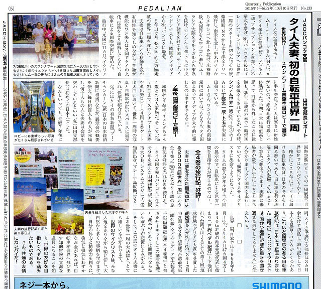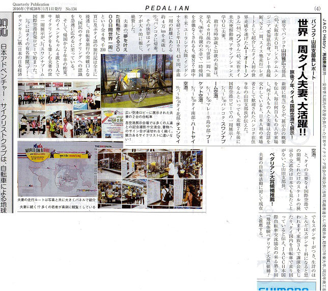 2016年、タイのムー・オートーンさん(44歳)とワンさん(45歳)夫妻(2001年11月~2007年11月、タイ人初の世界一周43カ国4万kmを走破。「夢を叶えた自転車による2000日世界一周」全4巻出版)は、一周後7年半の2015年夏からスワンナプーム等主要国際空港ロビーで世界一周展を開催(日本の日経新聞にあたる新聞社が大々的に応援)。この類を見ない大活躍は下記ペダリアン133号5面、134号4面において、その活動の経緯、その活躍の意義が大賞に値する詳細を掲載した。が、夫妻への大賞授与が叶わず、幻となったことは誠に残念であり、夫妻の栄誉を2016年「幻の第5回地球体験ペダリアン大賞」として栄誉をJACCは称えることとなった。