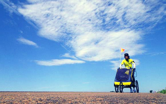※日中の気温が45度を記録した猛暑のアメリカ合衆国カンザス州より、ランニング中の高繁勝彦会員から体験レポートが届きました。高繁さんのチャレンジはアメリカ西海岸ロサンゼルスから東海岸ニューヨークを目指してバギー(ジョギング用ベビーカー)を押して、平和を訴えてのアメリカ合衆国ランニング横断です。(2011年8月1日)