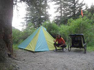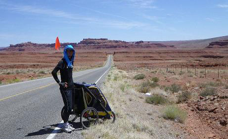 ロサンゼルスを離れ、熱く乾いた不毛の地を延々と走る砂漠の旅を終えれば、次は標高3000mの峠を越えるロッキー山脈の旅が始まった。勾配7パーセント程度の坂をバギーを押して歩くだけで、腕や肩、腰にどどっと疲れが集中する。自転車以上に登りは厳しい。それでも3309mの峠、ウルフクリークを制覇した後は、気持ちのいいダウンヒルを楽しめた。